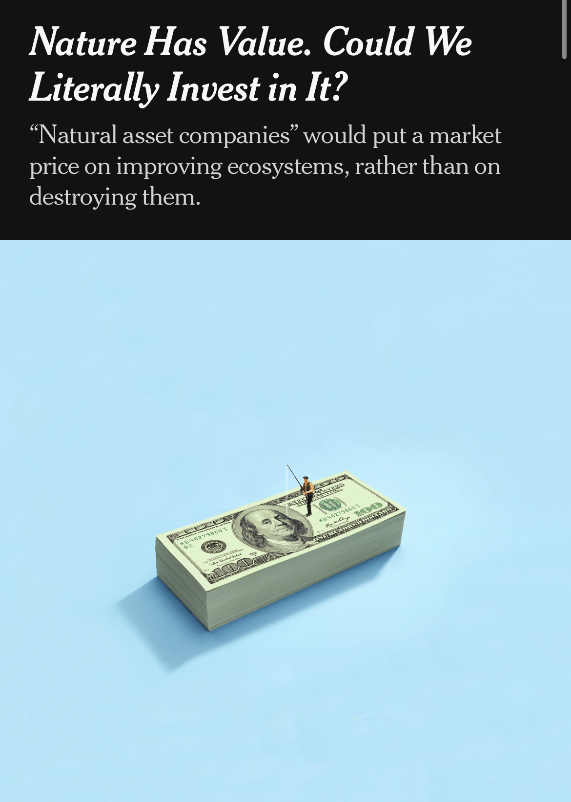 beh qualcuno ci sta provando, le Natural Asset Companies, e funziona un po’ così: chi possiede una risorsa accessibile (come un parco, un campo, una riserva), può creare una Nac che impone una licenza sui benefici che quella risorsa produce. Quotando la Nac su una borsa, i soldi derivanti dalla quotazione del titolo, serviranno proprio a finanziare la gestione e conservazione della risorsa stessa. È un po’ come pagare per entrare in un parco naturale.